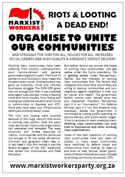 - Organise against riots and looting! Create elected and accountable, anti-tribal, anti-racist and anti-xenophobic community defence structures to protect infrastructure and save lives.