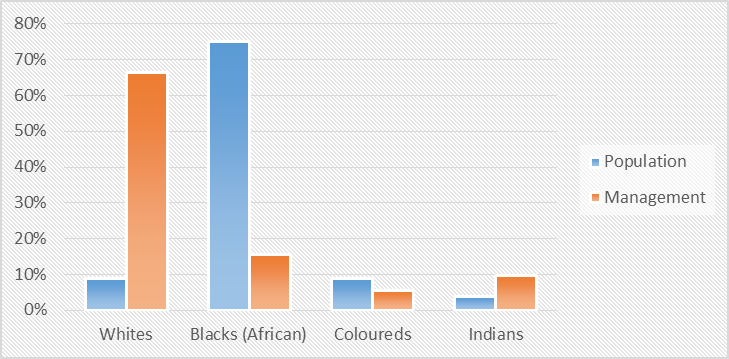 management positions do not correspond with the country’s demographics. (See DoEL, 2018