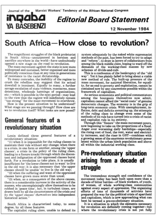 1984 has been marked by an industrial strike wave which, by mid-year, had already set a record for the number of work-days lost. It has seen the successful boycott of the coloured and Indian “elections”, leaving the government’s bought stooges doing an absurd “parliamentary” puppet-dance with no shred of credibility.
