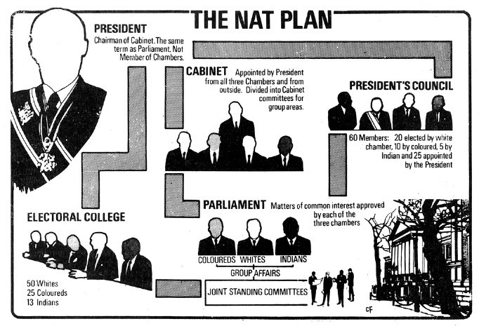 In 1977 its leaders denounced essentially similar NP proposals on the grounds that they entrenched racial division and dictatorship. In 1979 Allan Hendrickse vowed that “Coloured people would reject any constitutional proposals which did not include other black people”.[2]